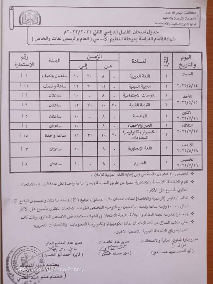جدول امتحانات الشهادة الإعدادية بالبحر الأحمر