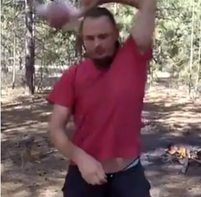 وقال وهو يقف في منطقة حرجية إنه يسمع "عظامها تنفجر"، مضيفًا: "إنها تشعر بالراحة"، ثم شوهد وهو يحوم بها حول رأسه متجاهلًا خوفها.
