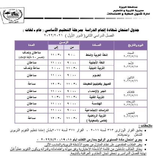 و تستغرق امتحانات الشهادة الإعدادية بمحافظة الجيزة 6 أيام وتستمر حتى يوم الخميس الموافق 19 مايو، وفيما يلي جدول امتحانات الشهادة الإعدادية بمحافظة الجيزة