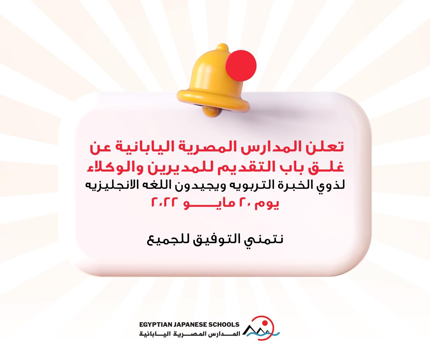 أعلنت المدارس المصرية اليابانية عن غلق باب التقديم للمديرين والوكلاء لذوي الخبرة التربوية ويجيدون اللغة الإنجليزية يوم 20 مايو 2022.
