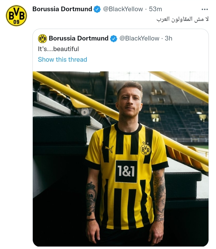 وكان الحساب الرسمي لنادي بوروسيا دورتموند الألماني، قام بمداعبة جماهير الكرة المصرية، خاصة المقاولون العرب بعدما أعلن عن قميصه الجديد للموسم الجديد 2022-2023 عبر صفحته على تويتر.