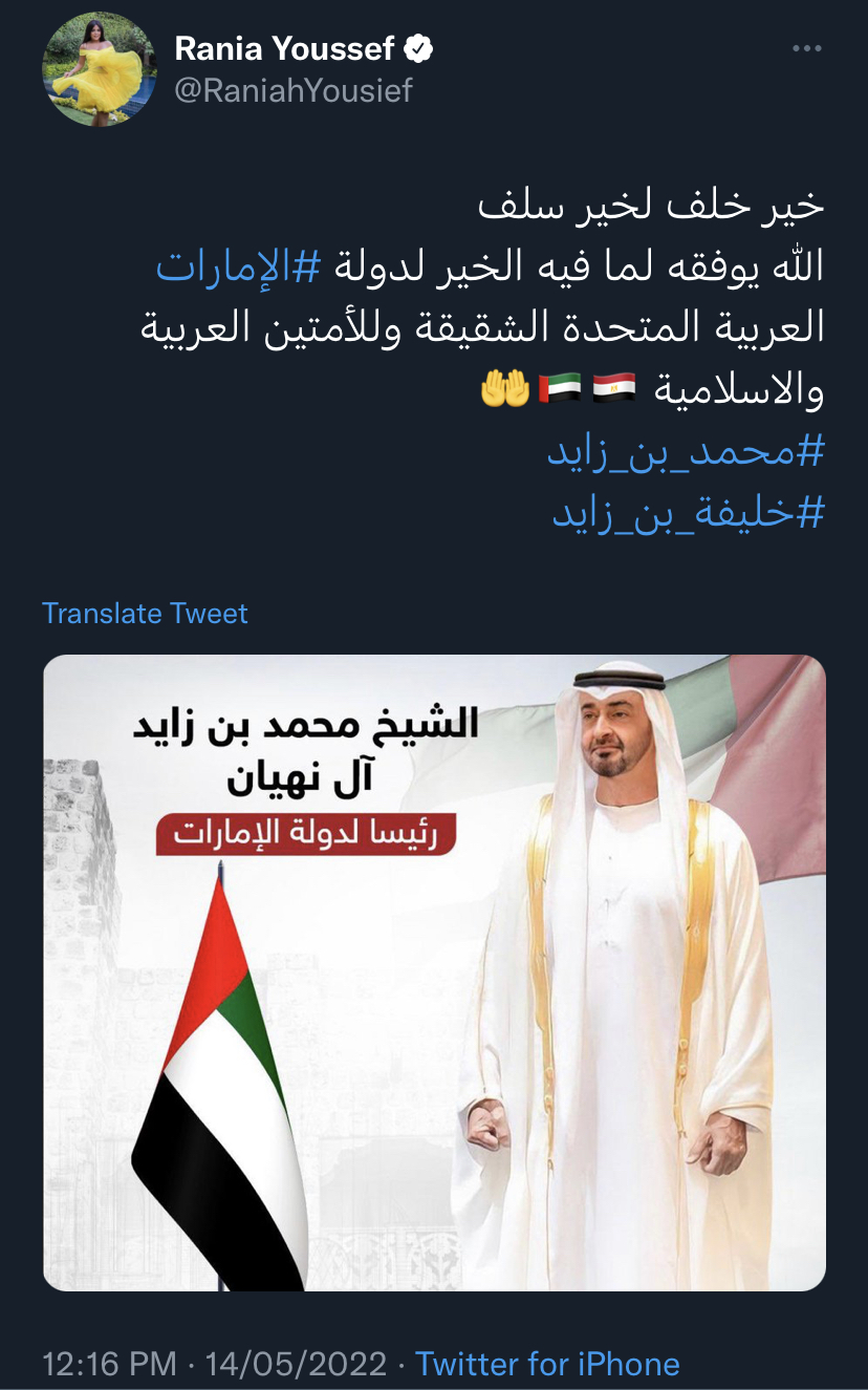 ونشرت رانيا يوسف صورة رئيس الإمارات الجديد، وعلقت عليها قائلة: "خير خلف لخير سلف.. الله يوفقه لما فيه الخير لدولة الإمارات العربية المتحدة الشقيقة وللأمتين العربية والإسلامية".