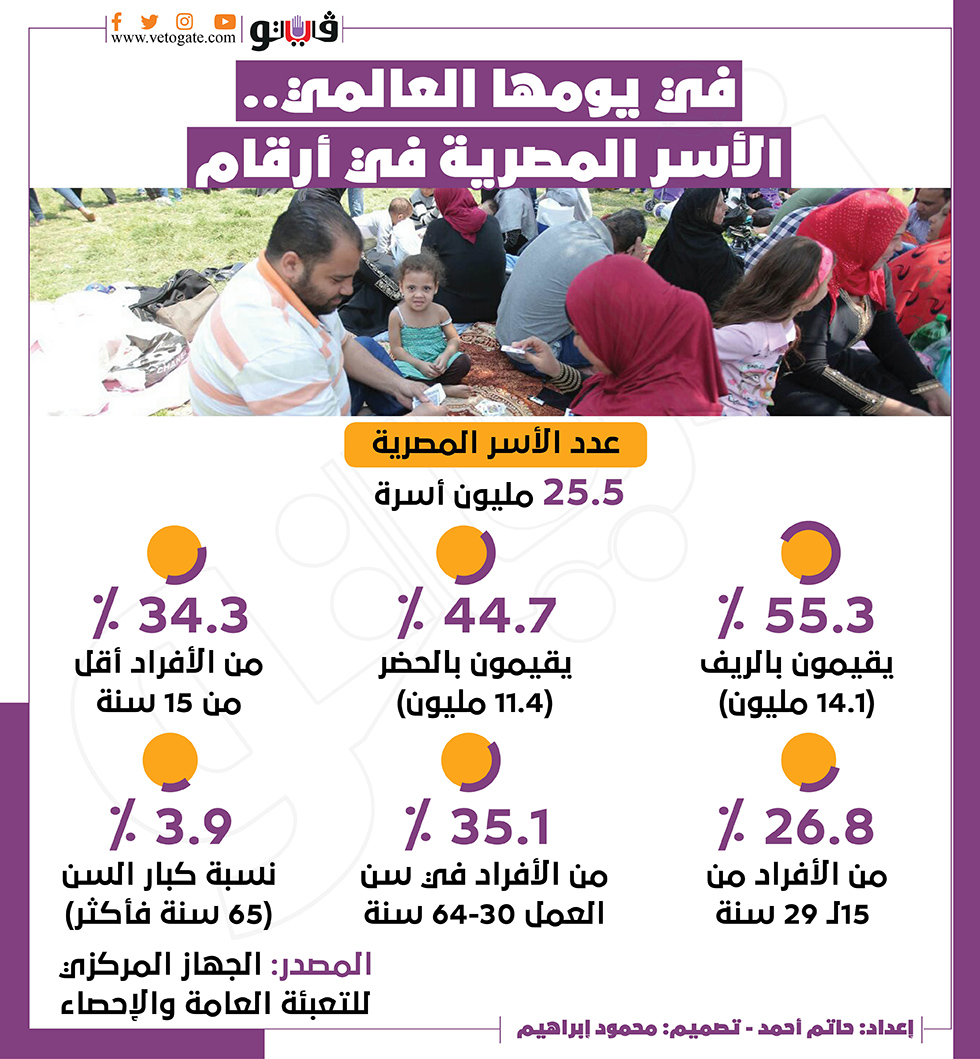 في يومها العالمي.. الأسر المصرية في أرقام | انفوجراف الأحد 15/مايو/2022 - 10:20 ص 5/15/2022 10:20:39 AM الأسرة المصرية حاتم أحمد شارك طباعة 18 حجم الخط شارك طباعة الأسرة المصرية الجهاز المركزى للتعبئة العامة والإحصاء عدد الأسر المصرية الريف الحضر