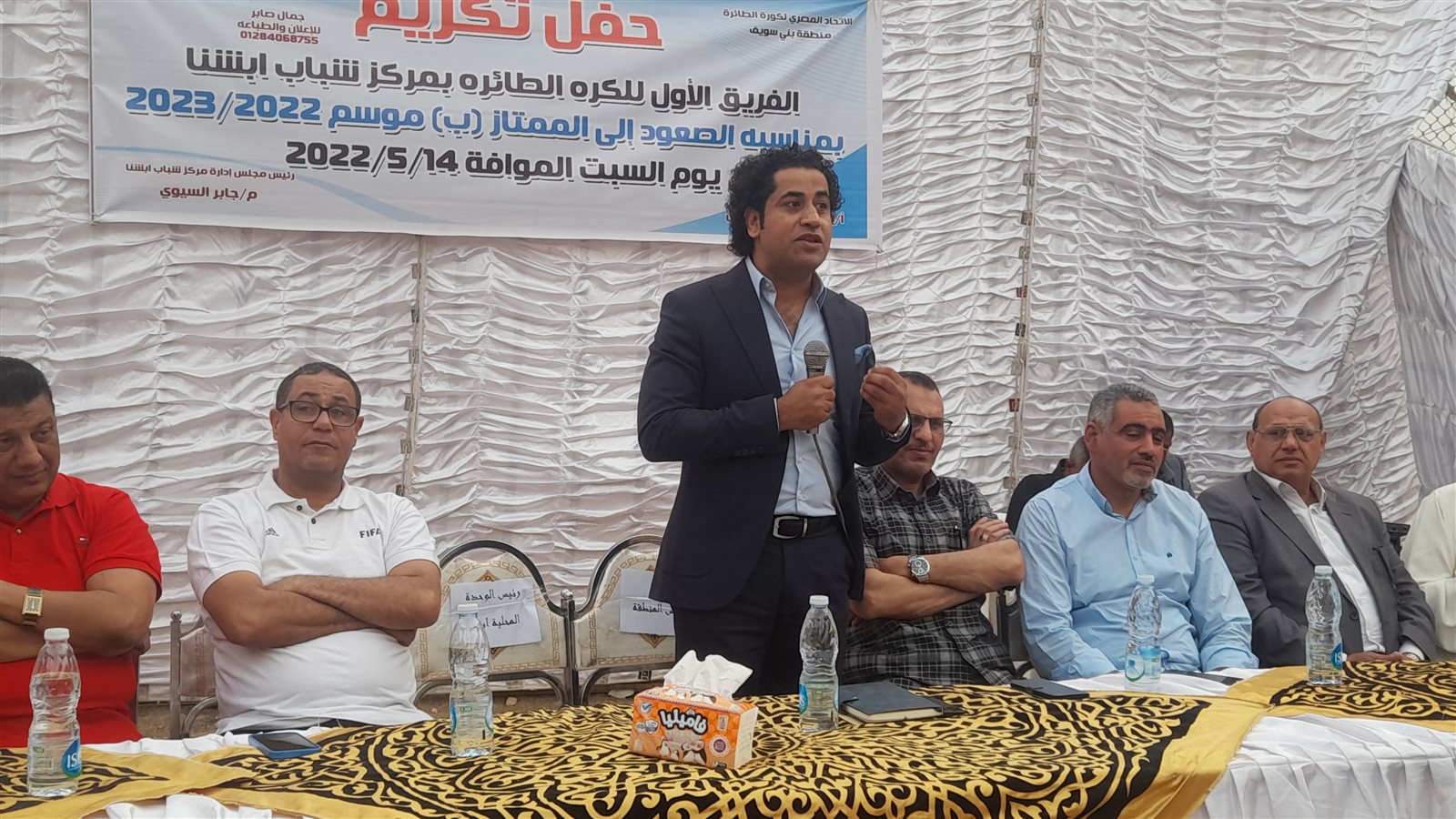 جاء ذلك في حضور عدد من الرياضيين بمحافظة بني سويف أبرزهم توني عثمان، رئيس نادي الشبان المسلمين، وسيد الأمين نقيب الرياضيين، وعدد من نجوم الكرة الطائرة ببني سويف بالإضافة إلى لفيف من الصحفيين والإعلاميين.