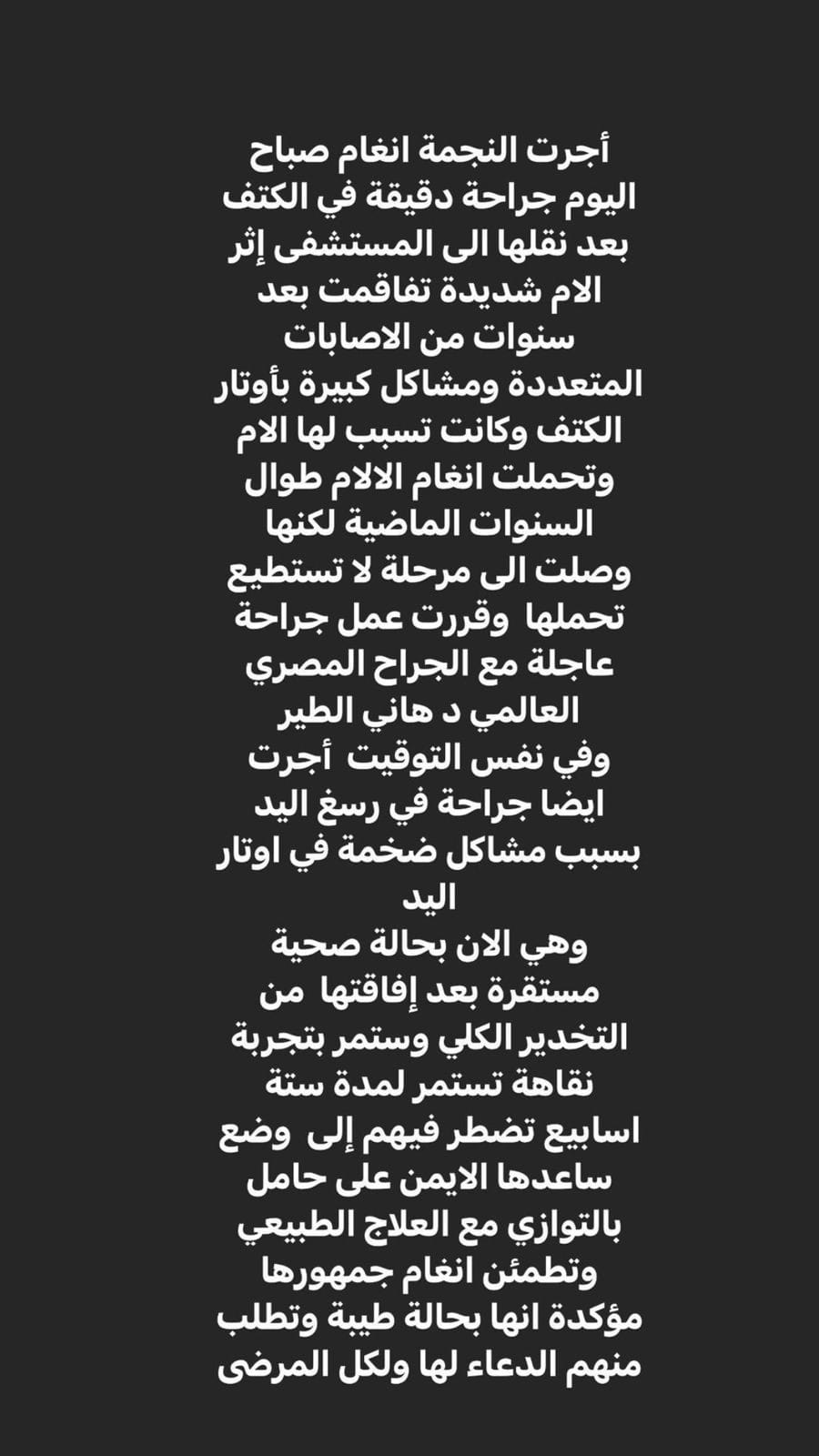 ولفتت إلى أن أنغام ستقضي ستة أسابيع فترة نقاهة ستضطر خلالها إلى وضع ساعدها الأيمن على سيدة حامل بالتوازي مع العلاج الطبيعي، وطالبت الجمهور بالدعاء لها ولكل المرضى.