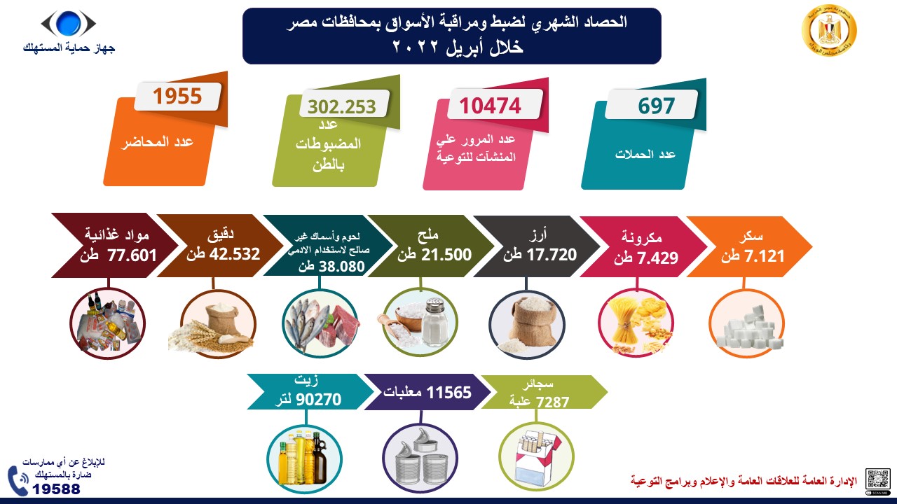 وشن جهاز حماية المستهلك 697 حملة على مستوى20 محافظ وذلك خلال شهر أبريل 2022، وأسفرت الحملات عن المرور علي 10474 منشأه تجارية لبيع المواد الغذائية وضبط 302.253 طن مواد غذائيه منها مجهولة المصدر وبدون بيانات ومنتهية الصلاحية وحجب سلعة، وتحرير 1955 محضر للمنشآت المخالفة، وجائت المخالفات للكميات المضبوطة بين سلع مجهولة المصدر وسلع بدون بيانات مدونة على المنتج وعدم صلاحية للإستهلاك الآدمى وحجب السلع عن التداول.