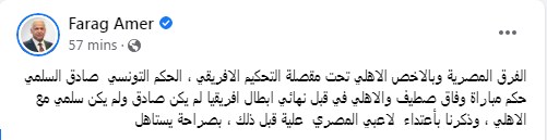 وكتب فرج عامر تدوينة على الفيس بوك "الفرق المصرية وبالاخص الاهلي تحت مقصلة التحكيم الافريقي، الحكم التونسي صادق السلمي حكم مباراة وفاق صطيف والاهلي في قبل نهائي ابطال افريقيا لم يكن صادق ولم يكن سلمي مع الاهلي، وذكرنا بإعتداء لاعبي المصري عليه قبل ذلك، بصراحة يستاهل"