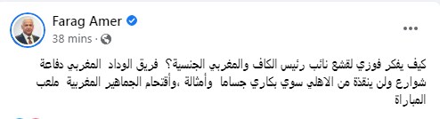 وتساءل فرج عامر قائلًا: "كيف يفكر فوزي لقشع نائب رئيس الكاف والمغربي الجنسية؟ فريق الوداد المغربي دفاعه شوارع ولن ينقذه من الاهلي سوى بكاري جساما وأمثاله،وأقتحام الجماهير المغربية ملعب المباراة"