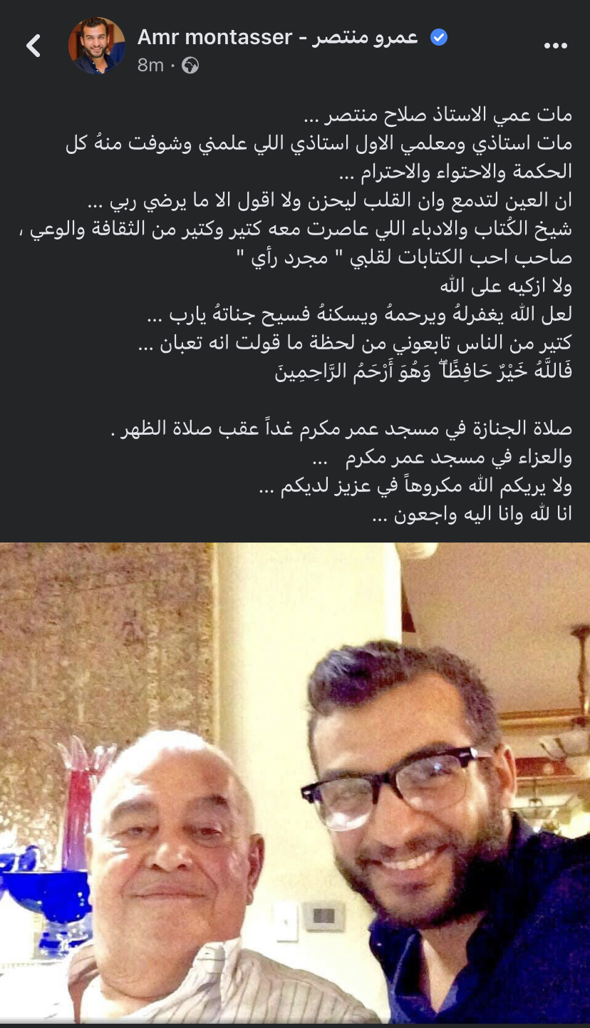 ونشر ابن شقيق الكاتب الراحل صورة تجمعه به معلقا عليها قائلا: "مات عمي الأستاذ صلاح منتصر … مات أستاذي ومعلمي الأول أستاذي اللي علمني وشوفت منهُ كل الحكمة والاحتواء والاحترام … إن العين لتدمع وإن القلب ليحزن ولا اقول إلا ما يرضي ربي".
