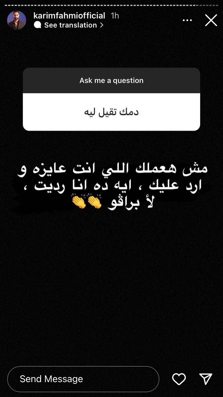 تعرض الفنان كريم فهمي ، لموقف محرج من قبل أحد المتابعين لديه علي موقع تبادل الصور والفيديوهات "إنستجرام" حيث قال المتابع لكريم فهمي :" أنت دمك تقيل ليه".