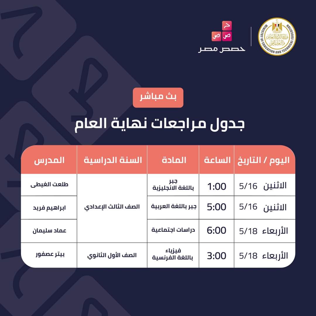 وأوضحت وزارة التربية والتعليم أنه يمكن للطلاب متابعة البث المباشر للمراجعات من حصص مصر، من يوم الإثنين 16 مايو حتى الخميس 19 مايو من خلال الرابط التالي