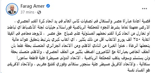 وكتب فرج عامر تدوينة على الفيس بوك "قضية اعادة مباراة مصر والسنغال في تصفيات كاس العالم في يد اتحاد كرة القدم المصري، الارض ممهدة تماما بشرط اللجوء للمحكمة الرياضية فوراستلام حيثيات لجنة الآنضباط"