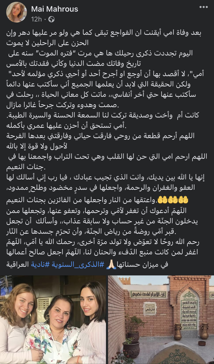 وكتبت مي محروس قائلة: "بعد وفاة أمي أيقنت أن الفواجع تبقى كما هي، ولو مر عليها دهر وإن الحزن على الراحلين لا يموت".
