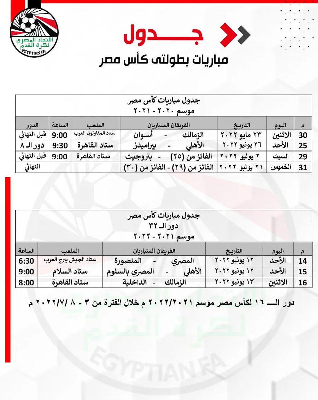 أعلن اتحاد الكرة مواعيد مباريات كأس مصر حيث أعلنت إدارة المسابقات باتحاد الكرة عن مواعيد بطولتي كأس مصر.