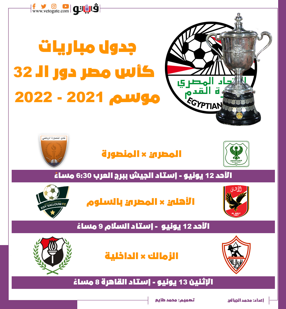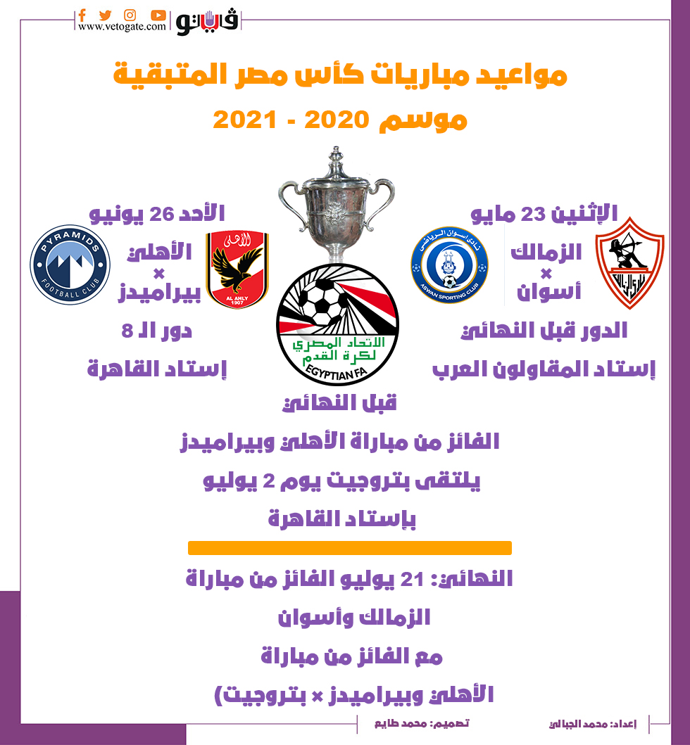 مواعيد مباريات كأس مصر | إنفوجراف الإثنين 16/مايو/2022 - 06:27 م 5/16/2022 6:27:19 PM كأس مصر شارك طباعة 18 حجم الخط شارك طباعة الأهلي بيراميدز كأس مصر الزمالك الزمالك وأسوان