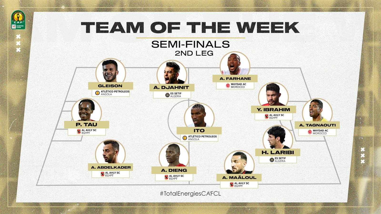 وضم التشكيل المثالي 5 لاعبين من الأهلي وهم، ياسر إبراهيم وعلي معلول وأليو ديانج وبيرسي تاو وأحمد عبد القادر.