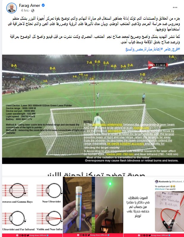 وكتب فرج عامر تدوينة على الفيس بوك "جزء من الحقائق والمستندات التي تؤكد إدانة جماهير السنغال في مباراة النهائي والتي توضح بقوة تمركز أجهزة الليزر بشكل منظم ومدروس ضد حراسة المرمى ولاعبي المنتخب الوطني. وبيان مدى تأثيرها على الرؤية وضررها على العين والتي تحتاج لاحترافية في استخدامها وتوجيها." وقال "كما ننشر التهديد بشكل واضح وصريح لمحمد صلاح نجم المنتخب. المصري وكنت نشرت من قبل فيديو واضح كل الوضوح بمراقبة وترصد صلاح بفندق الإقامة وسط غياب أمني. #فرج_عامر #إعادة_مباراة_مصر_والسنغال"