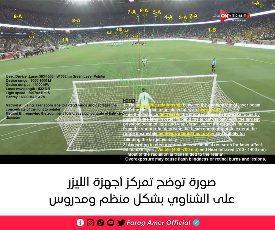 وكانت من المستندات التي استدل بها فرج عامر، والتي تمنح مصر حق إعادة مباراتها مع السنغال صورة توضح تمركز أجهزة الليزر علي حارس مصر في مباراة مصر والسنغال محمد الشناوي، مؤكدًا أن تمركز الليزر كان بشكل منتظم ومدروس. وطريقة تمركز الليزر على العين، وأيضًا شكل الليزر المستخدم في المباراة.