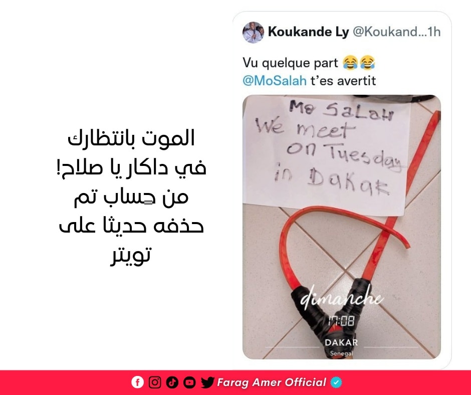 كما نشر فرج عامر تدوينة تم تهديد محمد صلاح، لاعب المنتخب، من خلالها وكُتب فيها "الموت بانتظارك في داكار يا صلاح" وتم حذف الحساب، الذي هدد محمد صلاح.