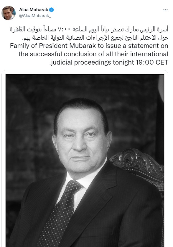 وكتب علاء مبارك تغريدة على تويتر "أسرة الرئيس مبارك تصدر بيانًا اليوم الساعة ٧:٠٠ مساءًا بتوقيت القاهرة حول الاختتام الناجح لجميع الإجراءات القضائية الدولية الخاصة بهم."