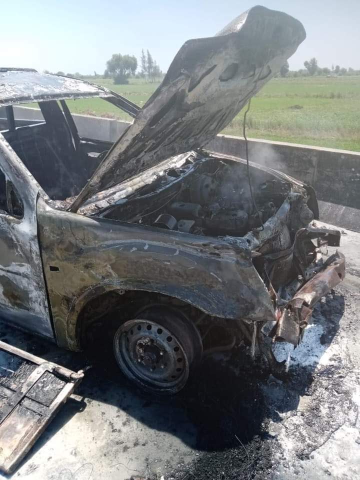 وانتقل على الفور ضباط مباحث المركز، ورجال الحماية المدنية، وتم الدفع بسيارة إطفاء تمكنت من السيطرة على الحريق، وتبين أن الحادث وقع بين سيارة نقل تحمل لوحات معدنية رقم د ر أ 5611، وأخرى رقم ط د ي 6425.