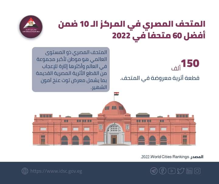 ونشر مركز المعلومات ودعم اتخاذ القرار بمجلس الوزراء بهذه المناسبة إنفوجراف عبر صفحته الرسمية على موقع التواصل الاجتماعي فيسبوك تحت عنوان "المتحف المصري في المركز العاشر ضمن أفضل 60 متحفا في 2022".