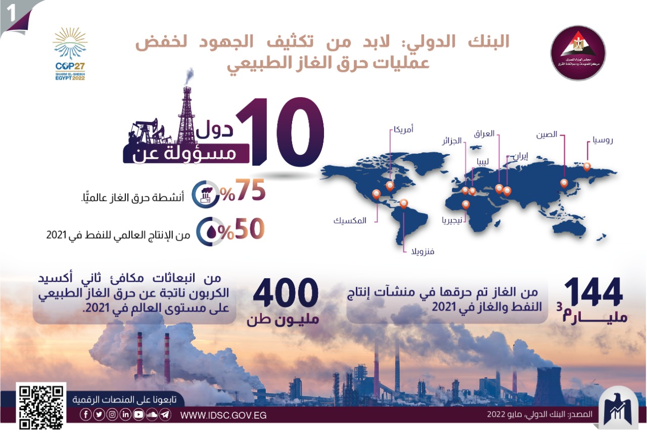 نشر مركز المعلومات ودعم اتخاذ القرار بمجلس الوزراء المصري إنفوجراف جديد يتضمن أبرز النقاط التي تناولها تقرير تتبع أنشطة حرق الغاز في العالم 2022 الصادر عن البنك الدولي في مايو 2022.