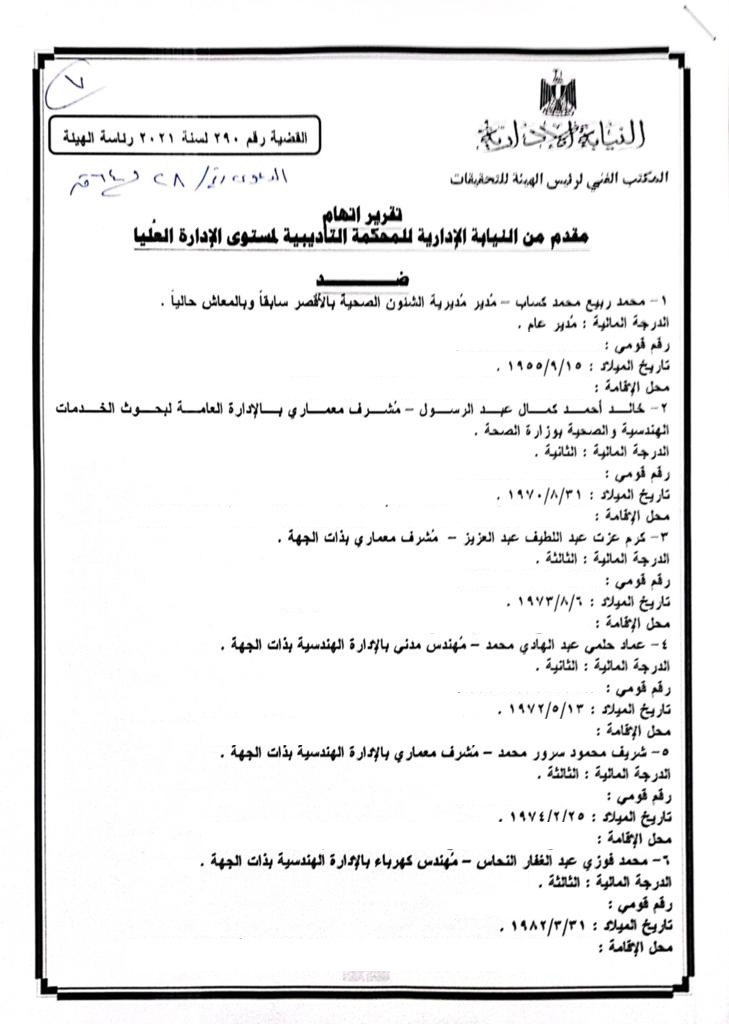 وكان تقرير قضائي صادر عن النيابة الإدارية كشف النقاب وقائع فساد مالي وإداري من العيار الثقيل داخل وزارة الصحة ومديرية الشئون الصحية بمحافظة الأقصر ترتب عليها استيلاء مقاول عملية إنشاء مستشفى إسنا المركزي على المال العام، وأحيل على إثرها مدير مديرية الشئون الصحية بالأقصر و5 مسؤولين بديوان عام وزارة الصحة للمحاكمة العاجلة.