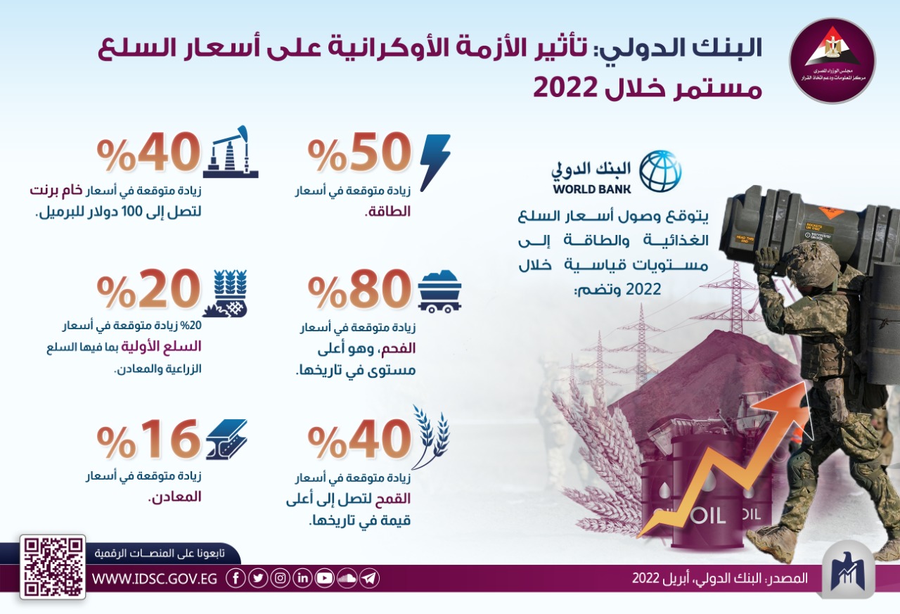 نشر مركز المعلومات ودعم اتخاذ القرار إنفوجراف جديدا يتناول تأثير الأزمة الأوكرانية على أسعار السلع العالمية خلال 2022، حيث توقع البنك الدولي أن ترتفع أسعار الطاقة بنحو 50% خلال 2022.