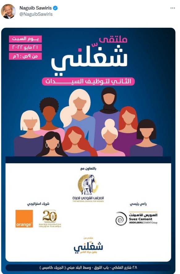 وكتب نجيب ساويرس في تغريدة سابقة على تويتر قال فيها: "شغلني هتنظم ملتقى توظيف مخصص للسيدات لدعم تمكين المرأة، هيتوفر فيه فرص عمل مميزة أكتر من أكبر الشركات في مصر. الملتقى يوم السبت ٢١ مايو ٢٠٢٢ من ٩صباحا - ٦مساء بمبنى الجريك كامپس بالتحرير."