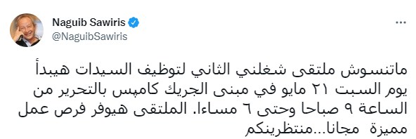 وكتب نجيب ساويرس تغريدة على تويتر: "ماتنسوش ملتقى شغلني الثاني لتوظيف السيدات هيبدأ يوم السبت ٢١ مايو في مبنى الجريك كامپس بالتحرير من الساعة ٩ صباحا وحتى ٦ مساء. الملتقى هيوفر فرص عمل مميزة مجانا…منتظرينكم".