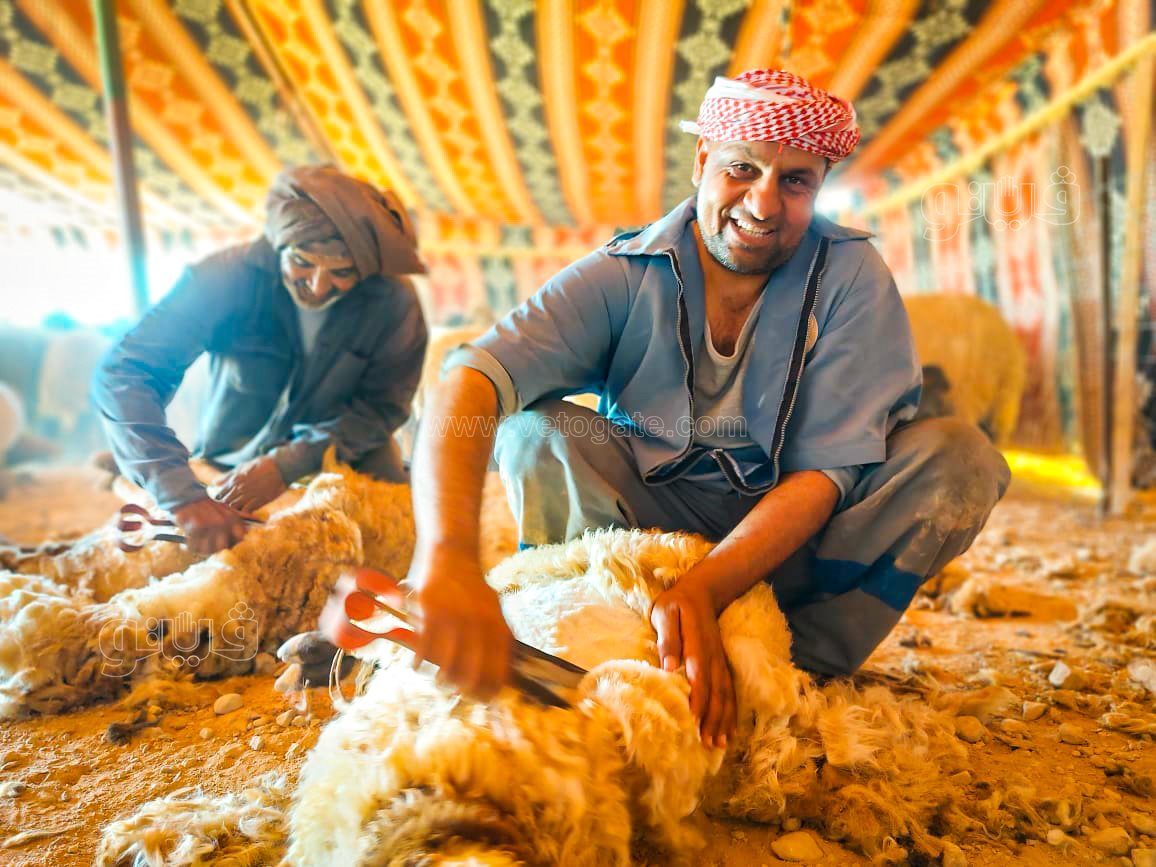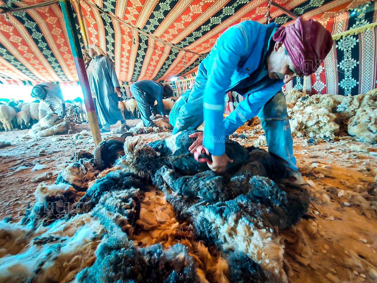 وتبدأ عملية جز صوف الأغنام، بالتجمع في أحد نجوع الصحراء بعيدًا عن الطريق وإقامة خيام للأهالي، وتجميع الأغنام في مكان مخصص مُحاط بالأسلاك منعا للهروب، ويستخدم الجلَّام في ذلك مقصات يدوية، وآخر معه حقن من الفيتامينات والحليب لتعويض الأغنام بالفيتامينات اللازمة.