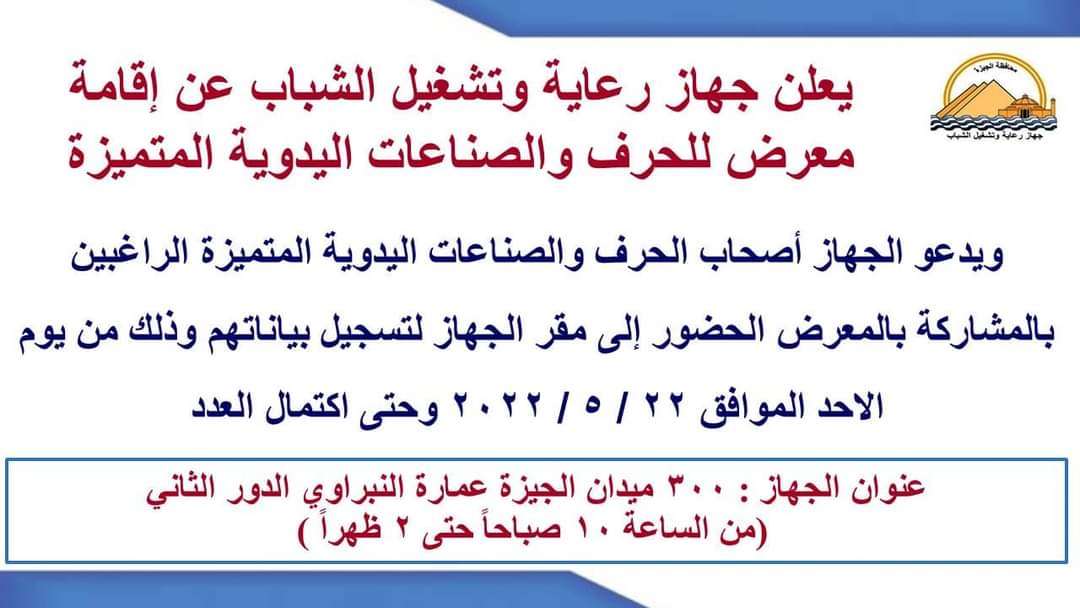 أعلن جهاز رعاية وتشغيل الشباب بمحافظة الجيزة عن إقامة معرض للحرف والصناعات اليدوية المتميزة.