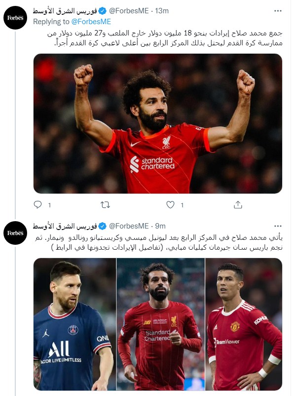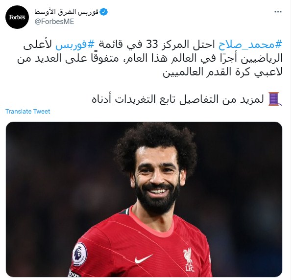وكتبت فوربس الشرق الأوسط عبر تويتر قائلة: "#محمد_صلاح احتل المركز 33 في قائمة #فوربس لأعلى الرياضيين أجرًا في العالم هذا العام، متفوقًا على العديد من لاعبي كرة القدم العالميين"