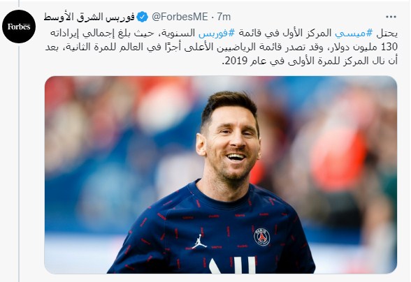 وكتبت فوربس الأمريكية عبر تويتر "يحتل #ميسي المركز الأول في قائمة #فوربس السنوية، حيث بلغ إجمالي إيراداته 130 مليون دولار، وقد تصدر قائمة الرياضيين الأعلى أجرًا في العالم للمرة الثانية، بعد أن نال المركز للمرة الأولى في عام 2019."
