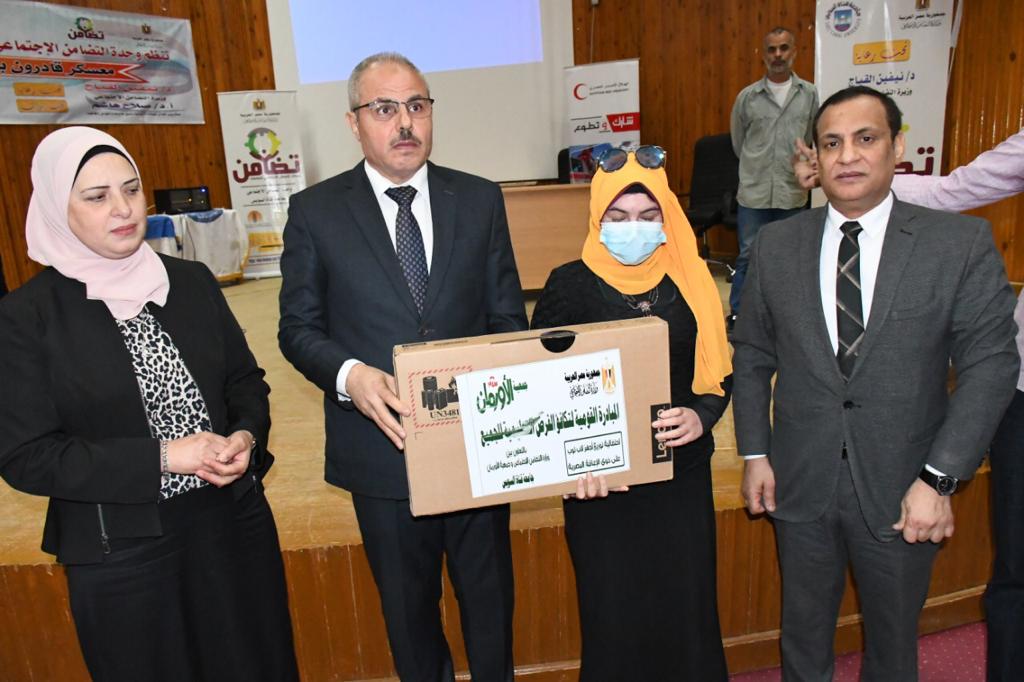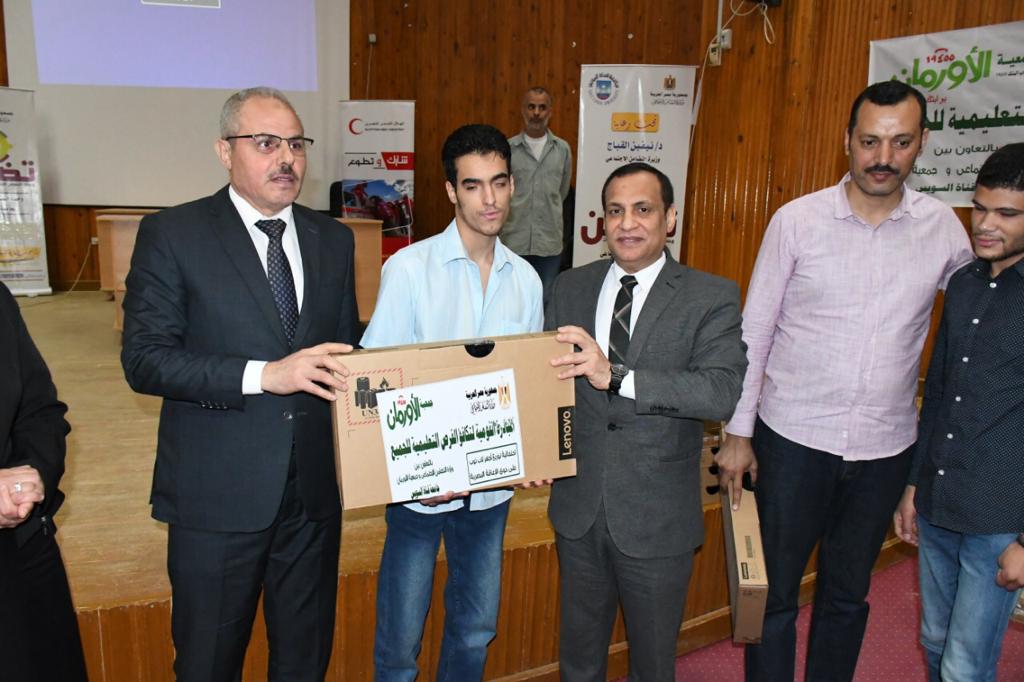 هذا وشهد اللقاء توزيع أجهزة لاب توب علي الطلاب من ذوي الهمم،ثم تم التقاط صور تذكارية مع رئيس الجامعة ووفد وزارة التضامن،وممثل جمعية الأورمان السيد رجب،وممثل جمعية الهلال الأحمر الدكتور محمود جمال.