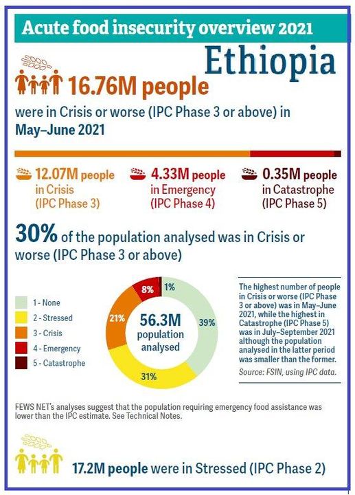 وأشار إلى أن إثيوبيا لديها 936 مليار م3 أمطار، و12 حوضا نهريا و46 بحيرة وحوالى 150 مليون فدان أراض خضراء زراعية ومراع وغابات، و100 مليون رأس بقر وأغنام، ومع ذلك طبقًا للتقرير فإن 60% من السكان الذين شملتهم الدراسة يعيشون فى مشاكل غذائية بين وضع كارثى (1%) وطوارئ (8%) وأزمة (21%) وضغوط (30)، و39% فقط هم الذين ليس لديهم مشاكل غذائية.