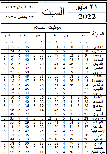 مواقيت الصلاة اليوم وفقًا للتوقيت المحلي لمدينتي القاهرة والإسكندرية وعدد من مدن ومحافظات الجمهورية: