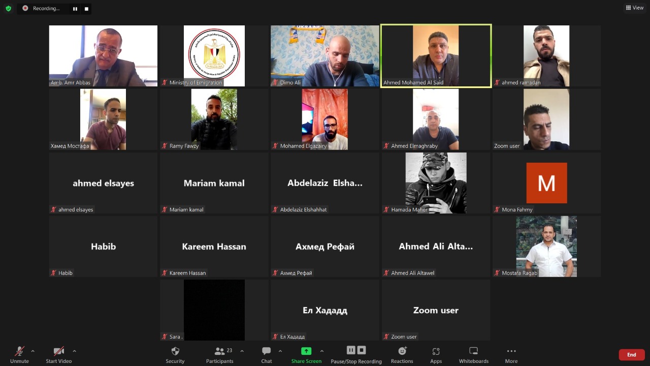في بداية اللقاء، رحب السفير عمرو عباس بالمشاركين من الجالية المصرية بأوكرانيا، مشيرًا إلى استمرار عمل غرفة العمليات التي تم تخصيصها لمتابعة موقف الجالية المصرية في أوكرانيا في ظل المستجدات والمتغيرات المتلاحقة، كما أنها على تواصل مستمر مع رؤساء الجالية المصرية بأوكرانيا للوقوف معهم على آخر مستجدات وتطورات الموقف داخل المدن المتواجد فيها المصريين، مثمنًا دور السيد أحمد السعيد نائب رئيس الجالية المصرية بأوكرانيا، مؤكدًا تقدير وزارة الهجرة لكافة الجهود التي يبذلها لدعم ومساعدة أفراد الجالية المصرية خلال الأزمة.
