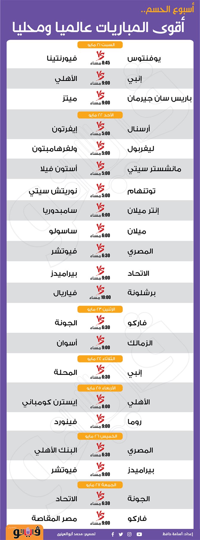 أسبوع الحسم.. أقوى المباريات عالميا ومحليا| انفوجراف الجمعة 20/مايو/2022 - 08:04 م 5/20/2022 8:04:37 PM مباريات الاسبوع اسامة حافظ شارك طباعة 18 حجم الخط شارك طباعة البنك الاهلي مانشستر سيتي ليفربول الأهلي الزمالك فيوتشر