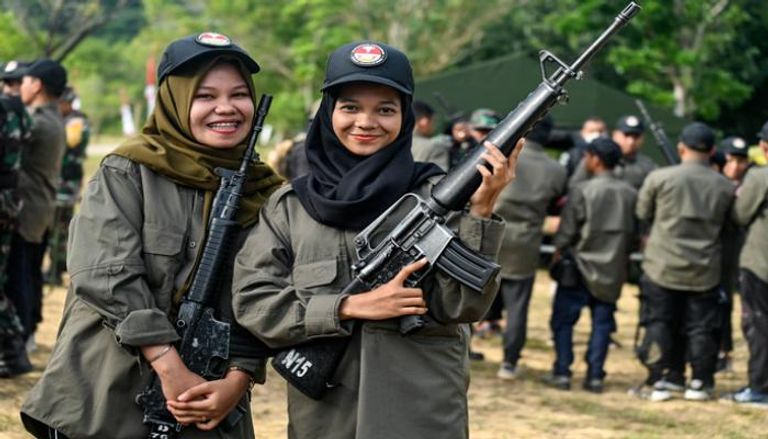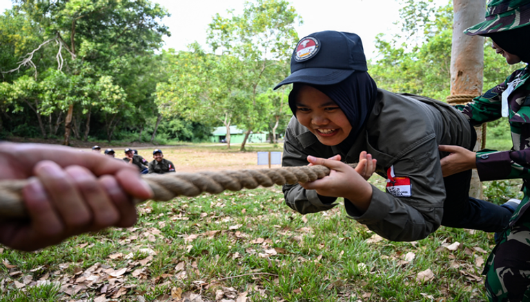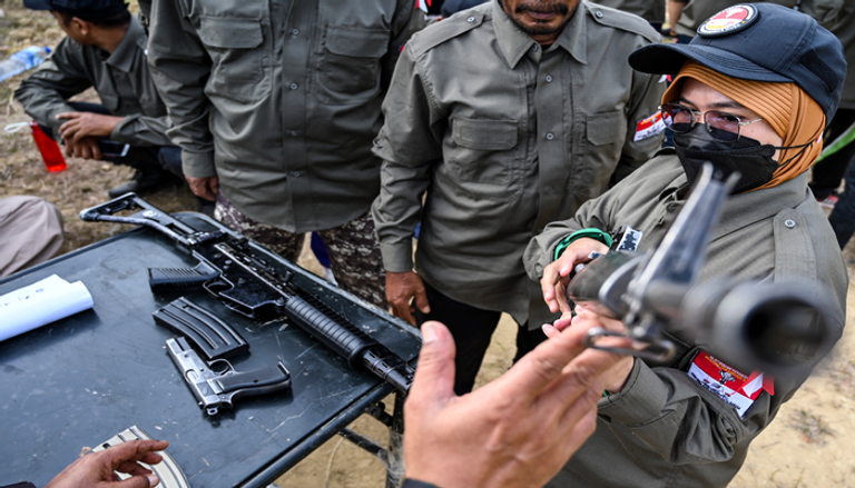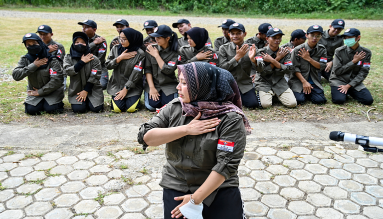 بلباس مميز ونظرات صارمة تتحدى ملامحهن الناعمة، تخضع فتيات إندونيسيات لتدريبات عسكرية على استخدام السلاح والقتال.