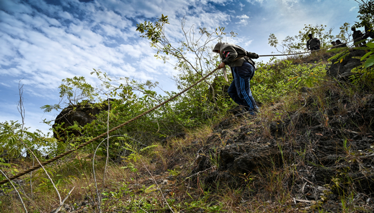 وبانتهاء مرحلة التسلق، يبدأ التدريب على النزول بالمناطق المنحدرة عبر محاكاة مشهد في مكان مخصص للغرض عبر استخدام حبل سميك يساعد الفتيات على حفظ توازنهن والنزول بسرعة أكبر.