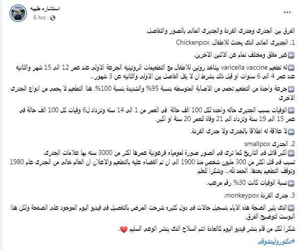وقال "نسبة الوفيات كانت 30% رقم مرعب. 3. جدرى القردة monkeypox. الذى يثير الضجة هذه الايام بتسجيل حالات فى دول كثيره شرحت المرض بالتفصيل فى فيديو اليوم الموجود على الصفحة ولكن هذا البوست لتوضيح الفرق."