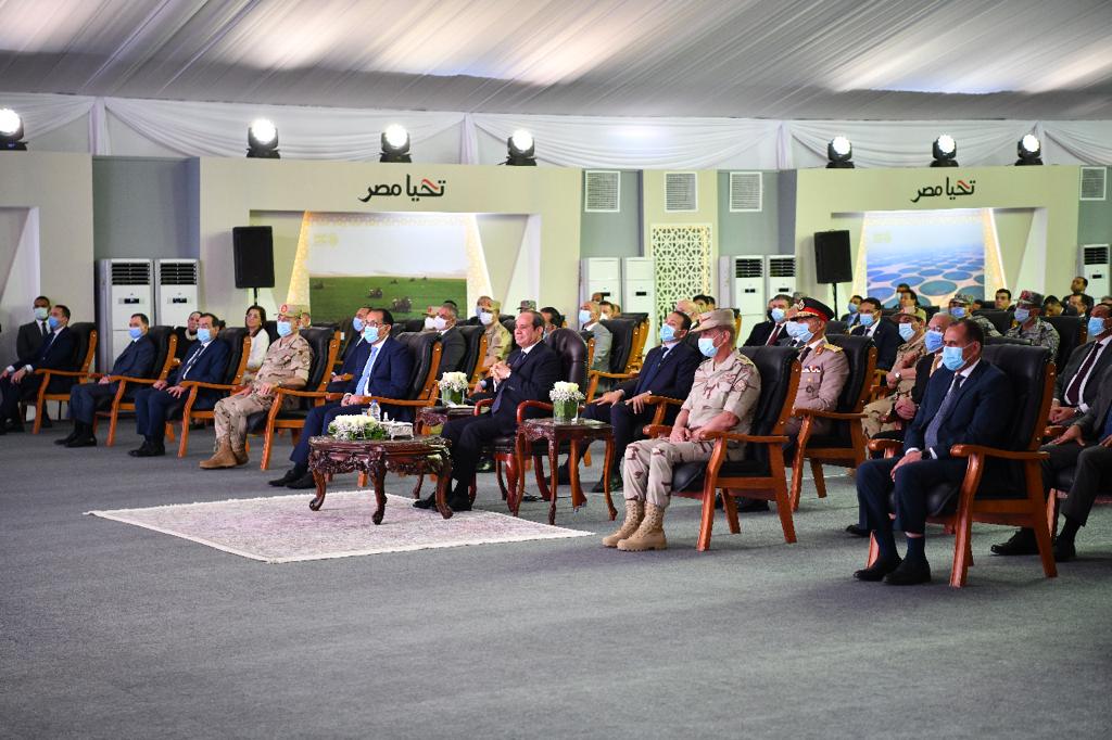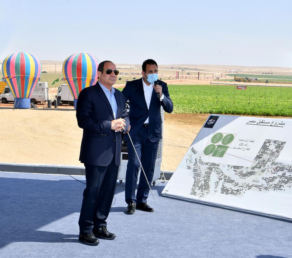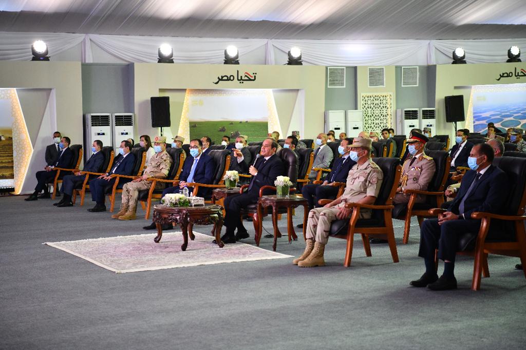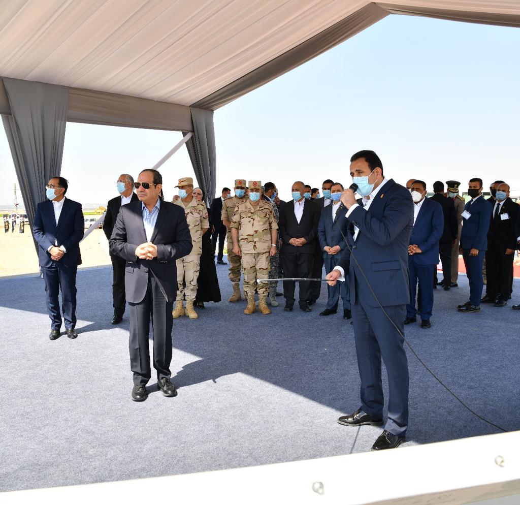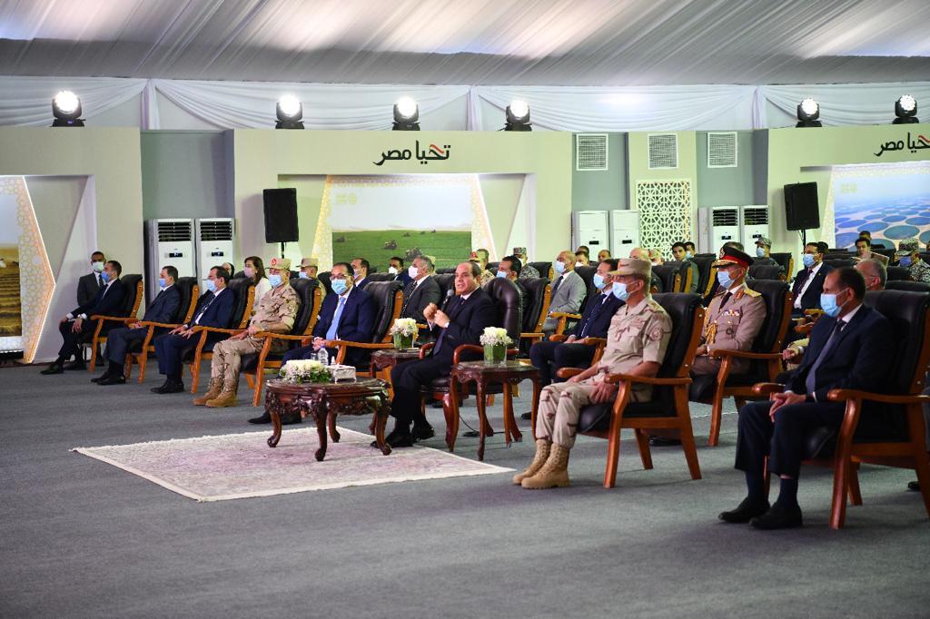 وافتتح الرئيس السيسي مشروع مستقبل مصر للإنتاج الزراعي، بطريق القاهرة - الضبعة، يرافقه الدكتور مصطفى مدبولي رئيس مجلس الوزراء، والفريق أول محمد زكي وزير الدفاع والإنتاج الحربي وعدد من الوزراء.