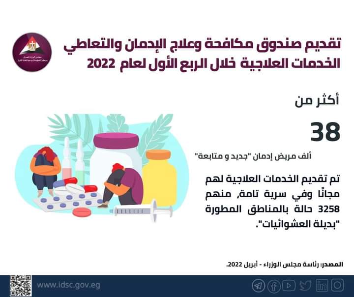 وأكد مجلس الوزراء أنه في إطار مجهودات صندوق مكافحة الإدمان خلال الربع الأول من العام الجاري، تم تقديم الخدمات العلاجية خلال أشهر يناير وفبراير ومارس لعام 2022 لـ 38 ألفًا و93 مريضًا "جديد ومتابعة".
