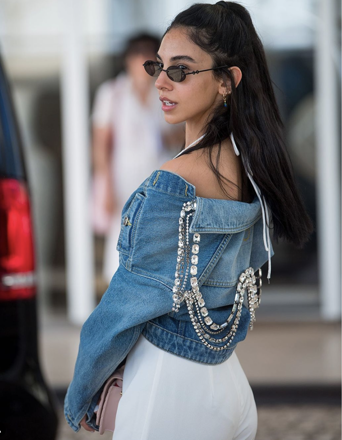 وأرتدت سلمي أبو ضيف بنطال أبيض وبلوزة بيضاء بسيطة وجاكت جينز أزرق اللون، وزينت إطلالتها بنظارة شمس وحقيبة بيج أنيقة.