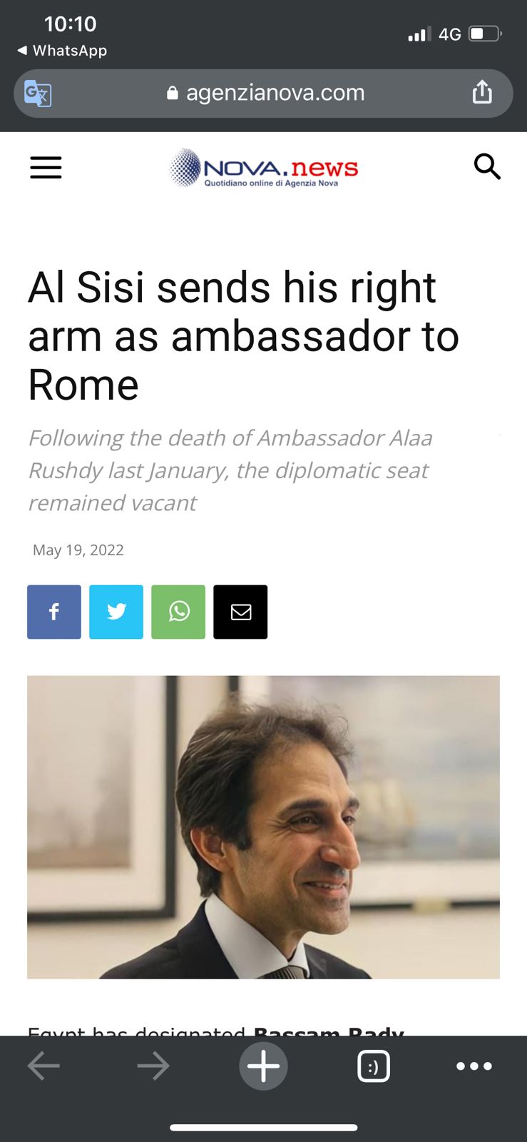 وكالات الأنباء الإيطالية: السيسي يرسل سفيرا من العيار الثقيل إلى إيطاليا مما قد ينهي الجمود بين البلدين.. مصر اهتمت باختيار شخصية دبلوماسية رفيعة المستوى.. محترف شديد الاتزان والحنكة الدبلوماسية