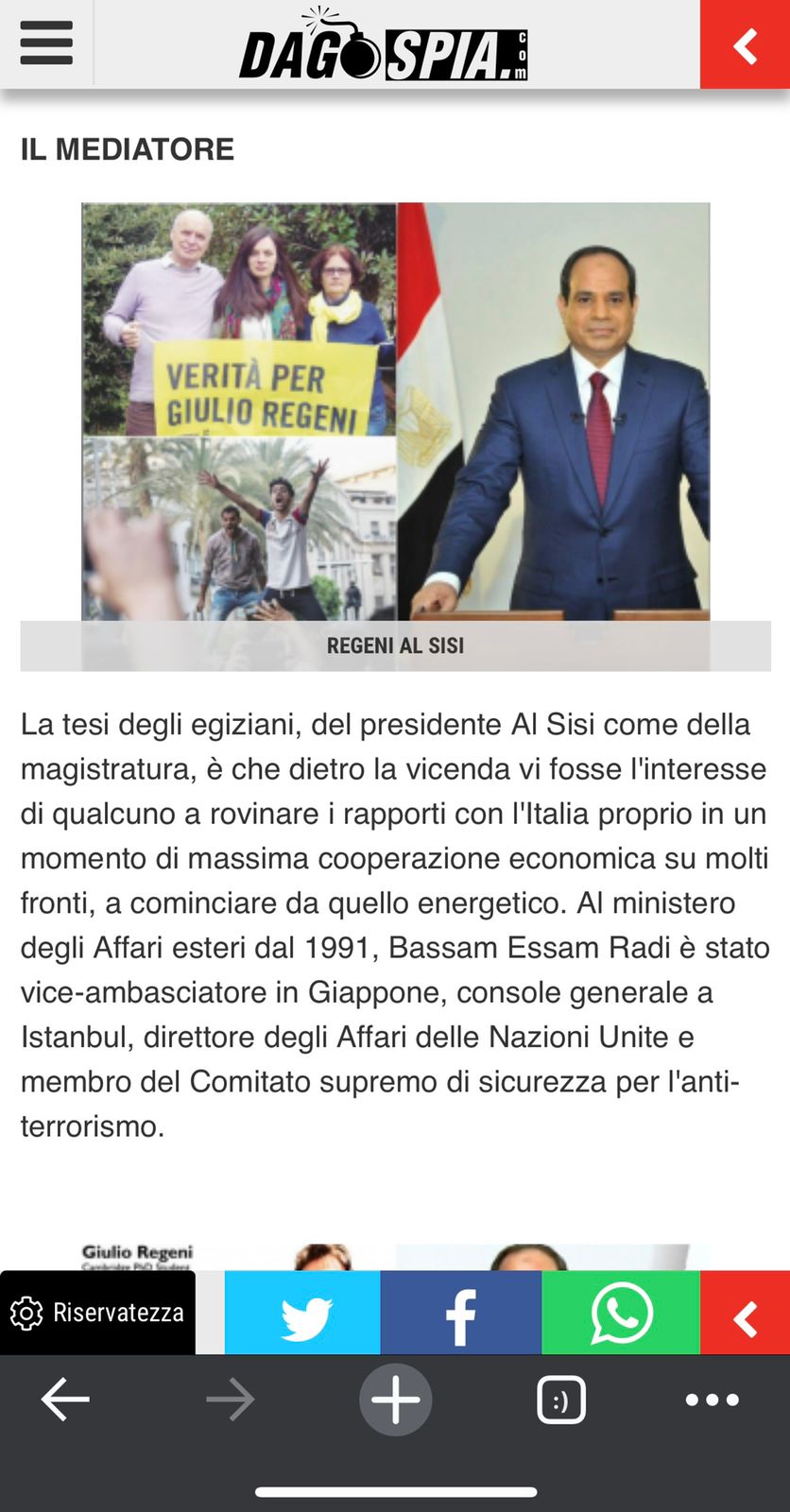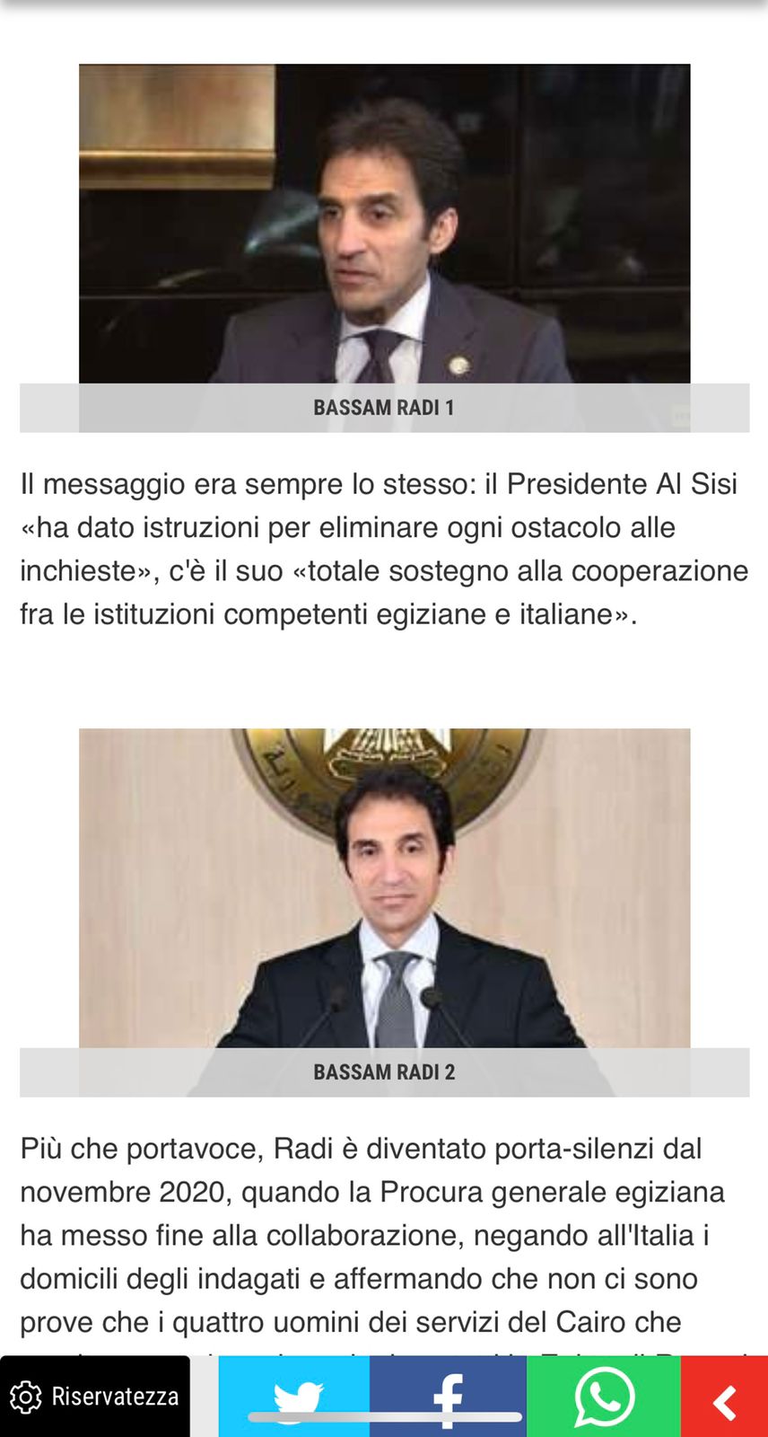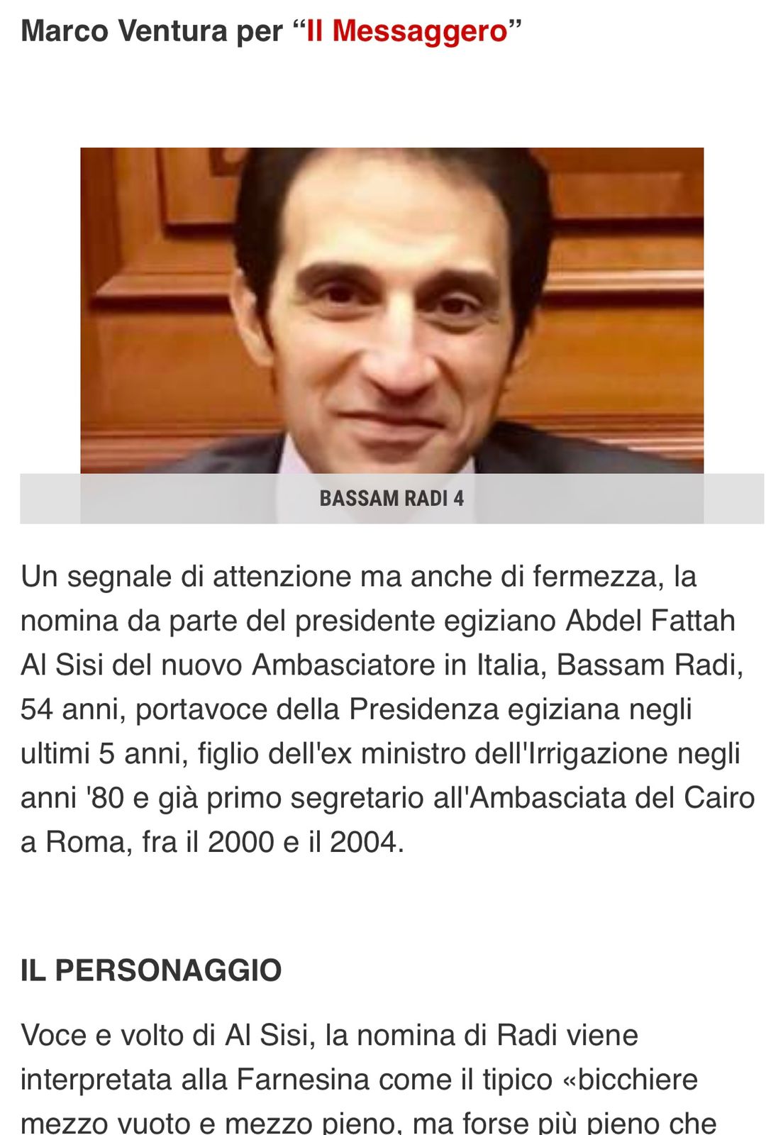 كما اوضحت وكالات الانباء الايطالية ان السفير بسام راضي لديه مسيرة مهنية طويلة كدبلوماسي محترف معروف عنه من لغة حديثه وتصريحاته انه شديد الاتزان والحنكة الدبلوماسية والسياسية، ولما لا وهو احد اعضاء دائرة المسؤولين القريبة جدًا من الرئيس السيسي، وهو ما يشير الى استثمار مصر في تعيين اهم سفير لديها لمنصب مهم، اخذا في الاعتبار التوترات الدبلوماسية الماضية بين البلدين الناجمة عن مقتل الباحث جوليو ريجيني الذي اختفى في القاهرة في يناير 2016 وعثر على الجثة بعد أيام قليلة في أحد أحياء العاصمة المصرية، لذلك فإن إرسال سفير من طراز راضي، الذي يجب الموافقة عليه من ايطاليا، يمكن أن ينهى حالة الجمود في العلاقات المصرية الايطالية ويساهم فى مسار التطبيع، لكنها تظل مشروطة بقضية ريجيني، هذا الحدث المأساوي الذي فرق البلدين، ويشير المحللون إلى أنه في النهاية "فأن الجانب الإيطالي لديه بكل تأكيد مصلحة في وجود شخص موثوق به ومؤثر ونافذ مثل السفير بسام راضي الذي على صلة مباشرة بالرئاسة المصرية".