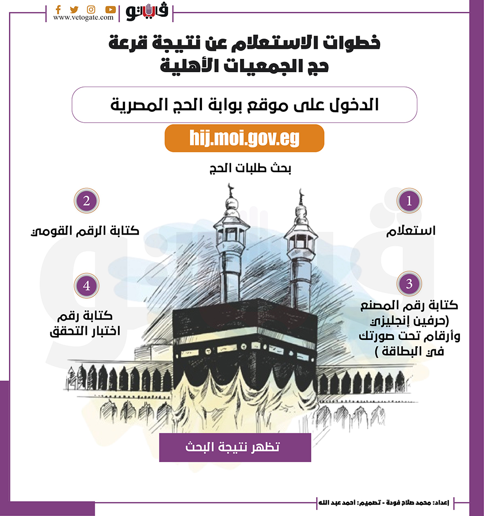 خطوات الاستعلام عن نتيجة قرعة حج الجمعيات الأهلية | إنفوجراف الأحد 22/مايو/2022 - 05:58 م 5/22/2022 5:58:00 PM قرعة حج الجمعيات الأهلية محمد صلاح فودة شارك طباعة 18 حجم الخط شارك طباعة الاستعلام عن نتيجة حج الجمعيات الأهلية نتيجة حج الجمعيات الأهلية حج الجمعيات الأهلية 2022 وزيرة التضامن الاجتماعي