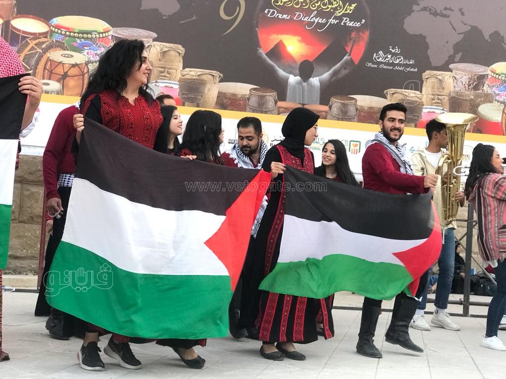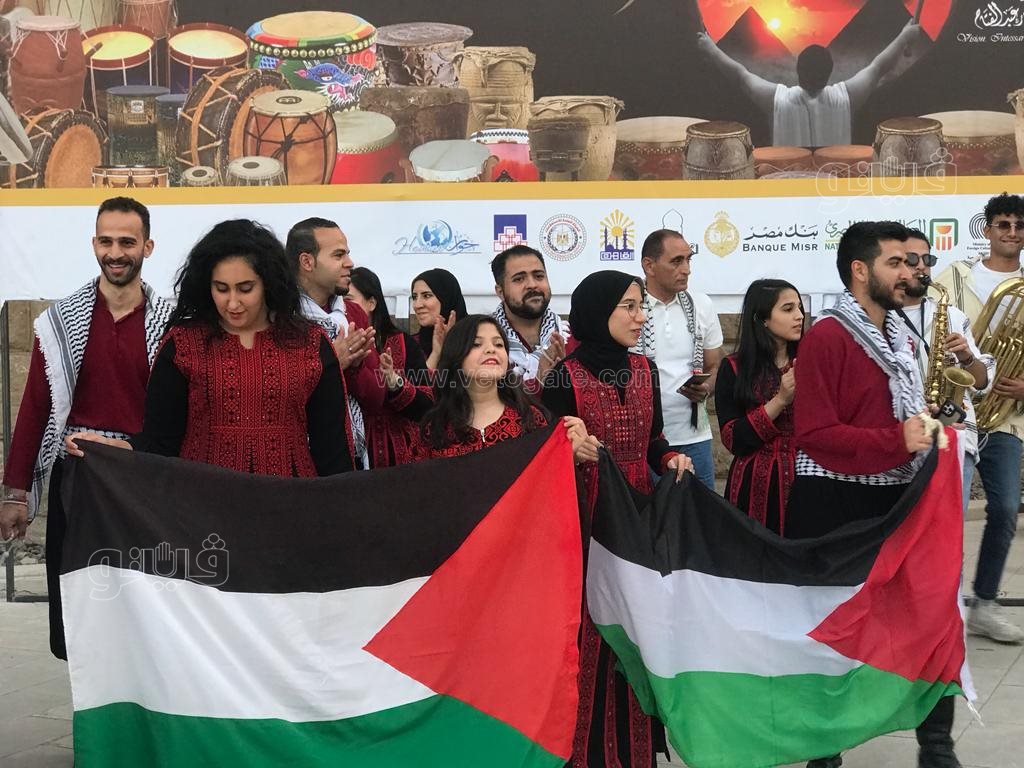 زين العلم الفلسطيني الأجواء الاحتفالية على مسرح سور القاهرة الشمالي بشارع المعز، وذلك ضمن عروض الفرق المشاركة في الدورة التاسعة من المهرجان الدولي للطبول والفنون التراثية، حيث تقام حاليا عروض الفرق على مسرح السور.